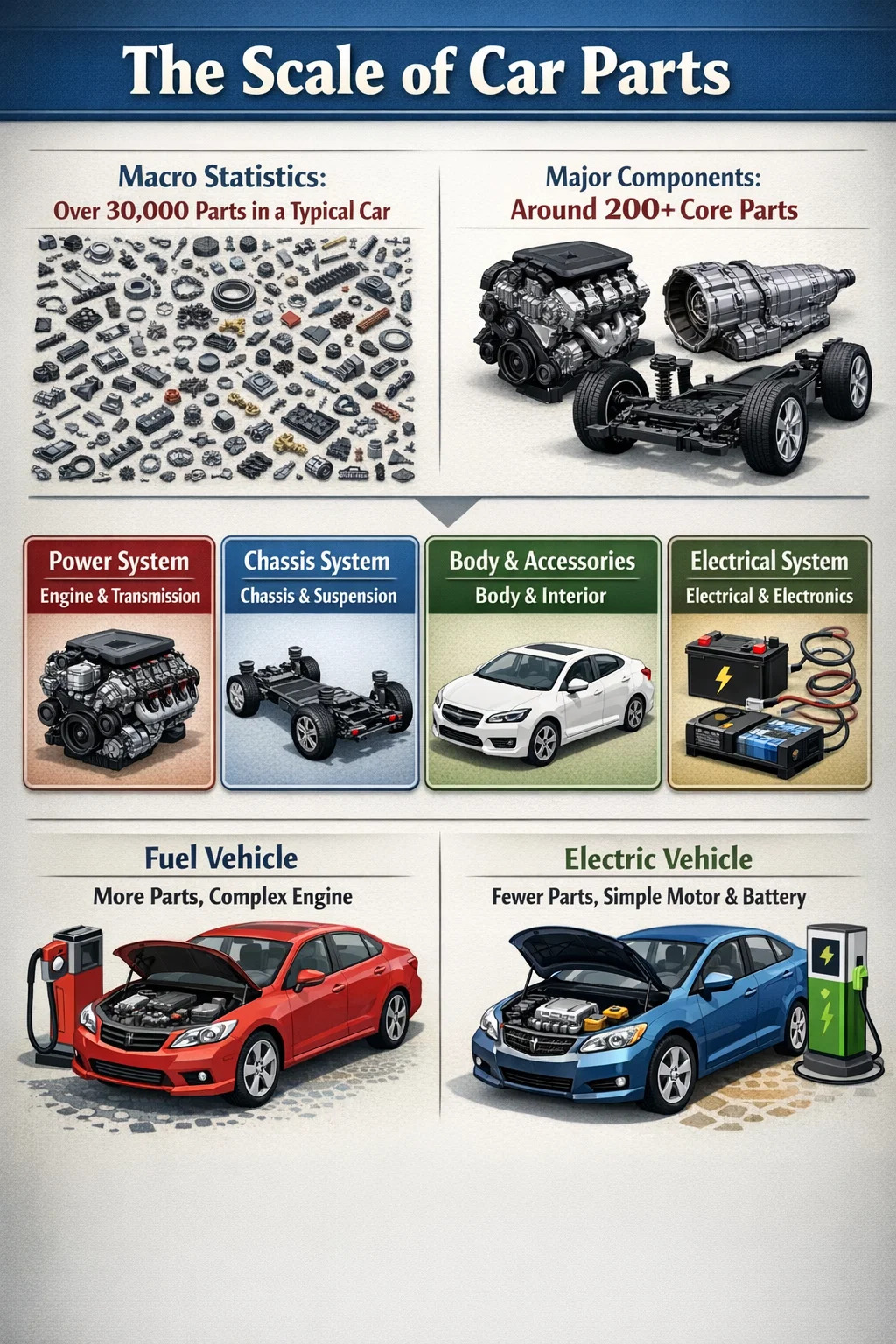 Má dhíchóimeáilimid carr síos go dtí na comhpháirteanna is lú, ag comhaireamh gach scriú, washer, agus sreang mar chuid ar leith, is gnách go gcuirtear carr teaghlaigh tipiciúil le chéile ó na mílte páirteanna uathoibríoch neamh-dí-dhíshuiteáilte. I gcás gluaisteáin rásaíochta thar a bheith casta, is féidir an líon seo a dhúbailt fiú.