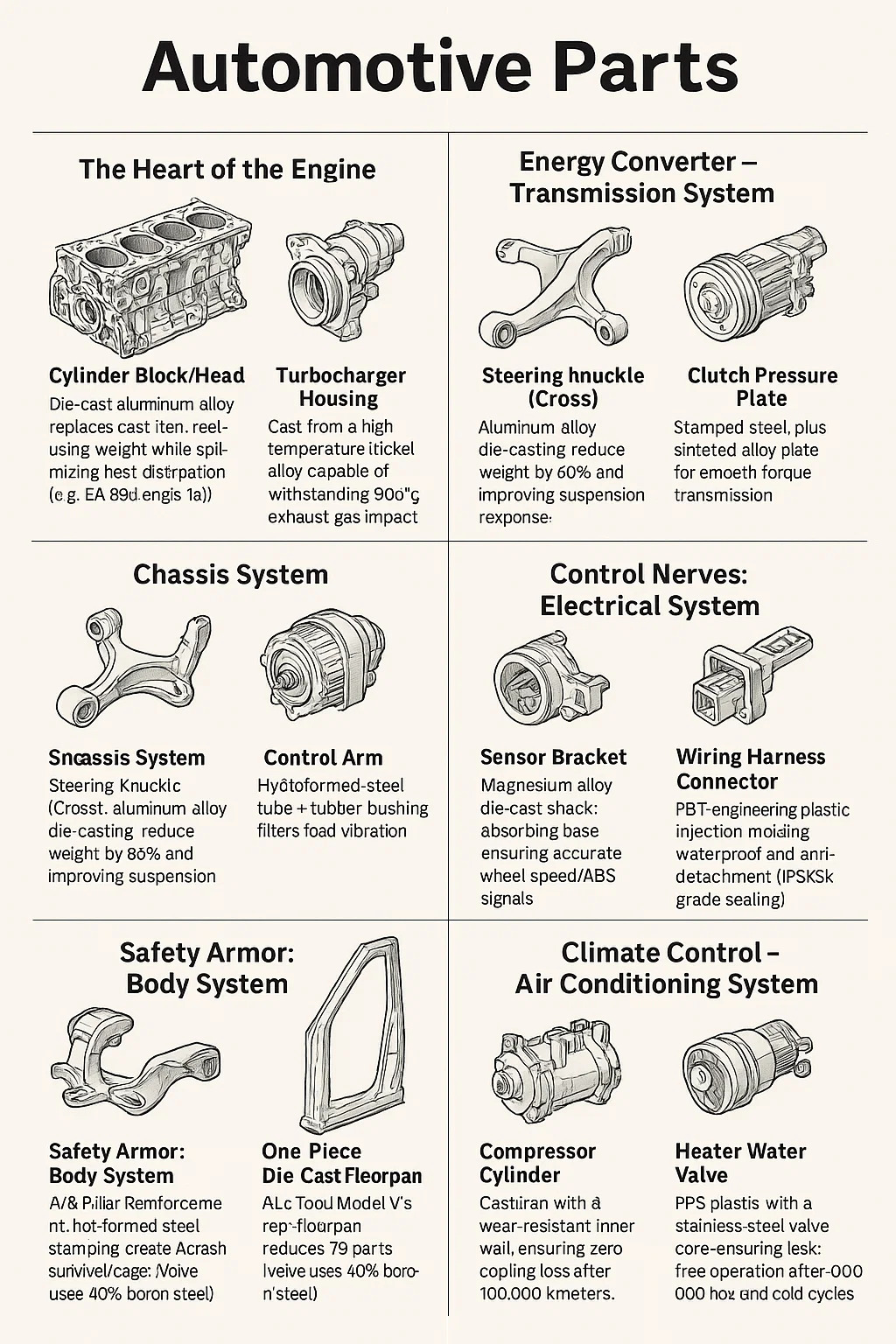 Páirteanna gluaisteán Cuimsíonn siad na céadta aonad feidhme a chuimsíonn feithicil, a rangú i sé phríomhchóras.