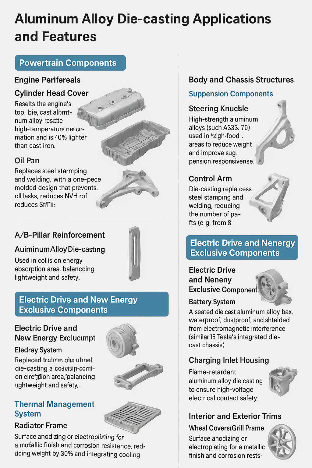 Die réitigh alúmanaim alúmanaim codanna feithicleach is príomhthiománaí iad chun feidhmíocht na ngluaisteán a fheabhsú agus a fheabhsú. Ag baint úsáide as réitigh ardbhrú, déantar cóimhiotal alúmanaim a dhéanamh i gcomhpháirteanna struchtúracha casta, in áit na gcomhpháirteanna cruach traidisiúnta. Is iad seo a leanas a chroíiarratais agus a ghnéithe: