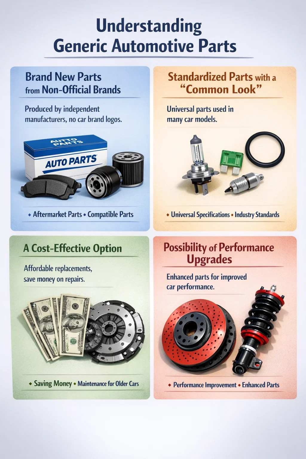 Míniú simplí: Uaireanta, táirgeann roinnt déantúsóirí atá ag speisialú i gcodanna ardfheidhmíochta na cineálacha páirteanna gluaisteán seo freisin. Féadfaidh siad a bheith níos marthanaí nó feidhmíocht níos fearr a bheith acu ná na codanna bunaidh, mar boinn le greim níos fearr nó dioscaí coscáin le diomailt teasa níos fearr. Soláthraíonn sé seo níos mó féidearthachtaí d'úinéirí gluaisteán thar na codanna bunaidh.