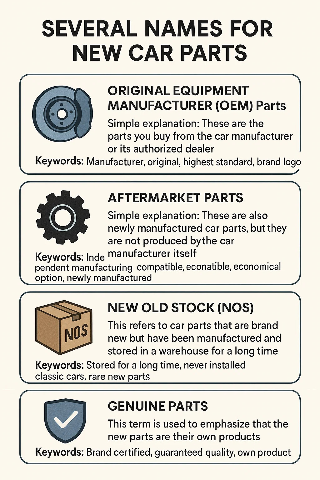 Míniú simplí: Is téarma níos sainiúla é seo. Tagraíonn sé do pháirteanna gluaisteán atá branda nua ach a mhonaraítear agus a stóráiltear i stóras ar feadh i bhfad. Níor úsáideadh riamh iad, agus d'fhéadfadh gurb é an pacáistiú bunaidh. Is minic a úsáidtear iad chun gluaisteáin clasaiceacha nó samhlacha scortha a dheisiú, toisc nach féidir leis an monaróir na codanna nua sonracha seo a tháirgeadh a thuilleadh.