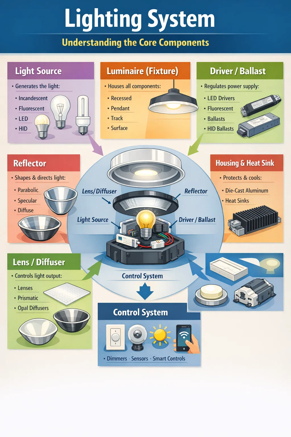 Ní bhaineann soilsiú amháin le soilsiú — is córas é a ndéantar innealtóireacht chúramach air agus é comhdhéanta de chomhpháirteanna ar leith, idirspleácha. I measc na gcomhpháirteanna lárnacha soilsithe tá an fhoinse solais, luminaire (daingneán), ballasta nó tiománaí, frithchaiteoir, lionsa nó diffuser, tithíocht, agus córas rialaithe. Tá ról sonrach ag gach cuid maidir le cinneadh a dhéanamh ar an gcaoi a dtáirgtear, a mhúnlaítear, a dháiltear agus a bhainistítear solas. Cibé an bhfuil tú ag dearadh plean soilsithe tí, ag bunú spás tráchtála, nó ag fabhtcheartú suiteáil atá ann cheana féin, tugann tuiscint na gcodanna seo buntáiste cinntitheach duit.