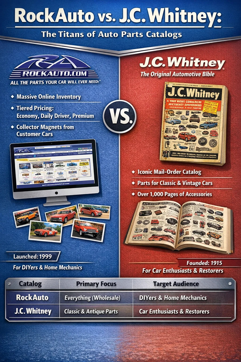 Nuair a chuireann daoine ceist faoin gcatalóg is cáiliúla de pháirteanna gluaisteáin, bíonn dhá ainm i gceannas ar an gcomhrá: Carraig Auto don aois dhigiteach agus J.C. Whitney le haghaidh tábhacht stairiúil. RockAuto anois mar an caighdeán óir nua-aimseartha, ag tairiscint bunachar sonraí uileghabhálach ar líne a chlúdaíonn beagnach gach chuid gluaisteán a mhonaraítear le blianta beaga anuas. Dóibh siúd a chuimhníonn ar ré na gcatalóga páipéir le hnódú poist, ba é J.C. Whitney an rí gan amhras, ar a dtugtar an "Bíobla" de shaol na ngluaisteán DIY.