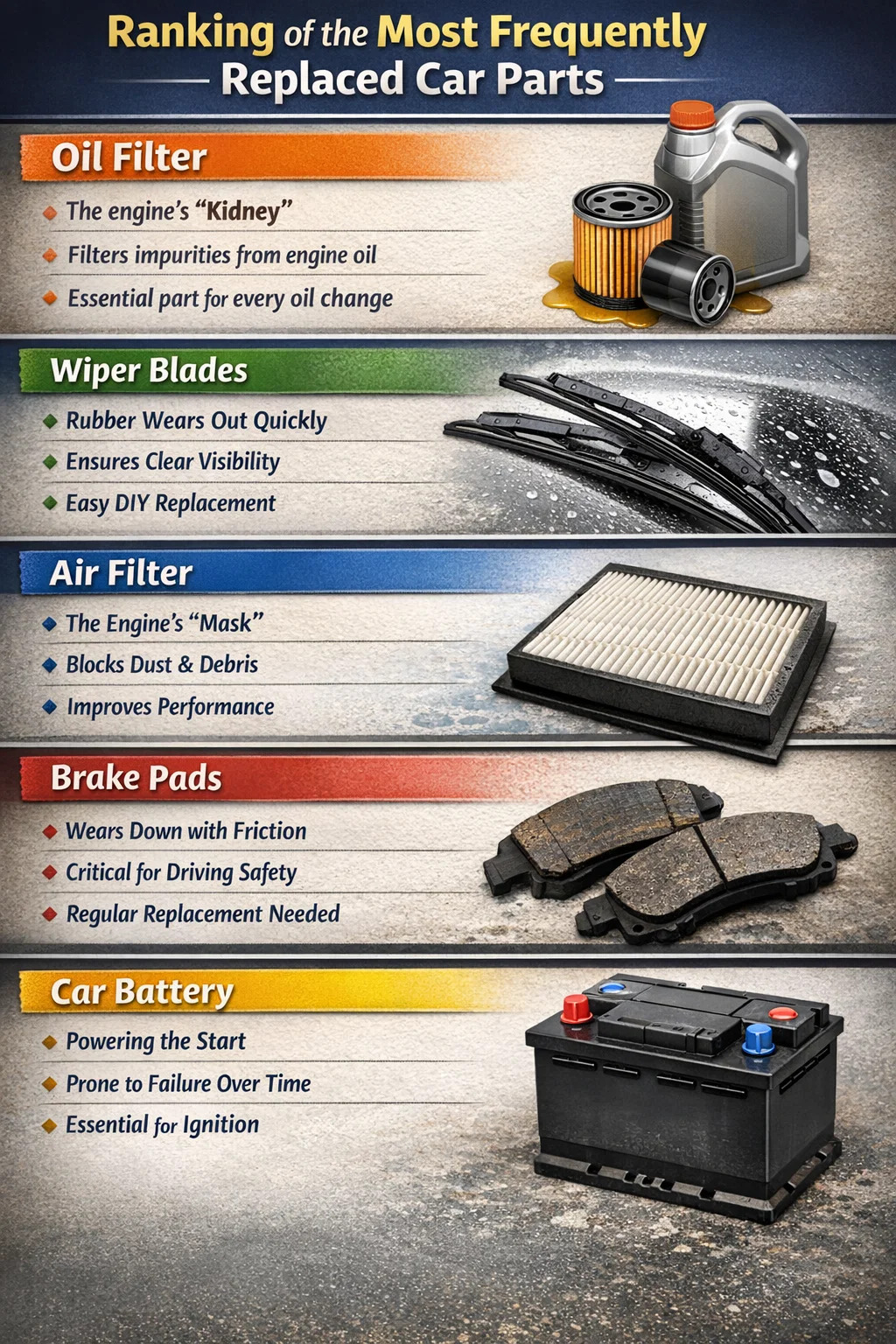 In úsáid laethúil cairr, tá codanna áirithe cosúil leis na stocaí nó boinn bróg a chaithimid - is "earraí inchaite" iad nach mór a athsholáthar go rialta. Dá mba rud é go raibh orainn an chuid den charr is gá a athsholáthar is minice a roghnú, is cinnte gur scagairí agus páirteanna caitheamh agus cuimilt a bheadh ann.